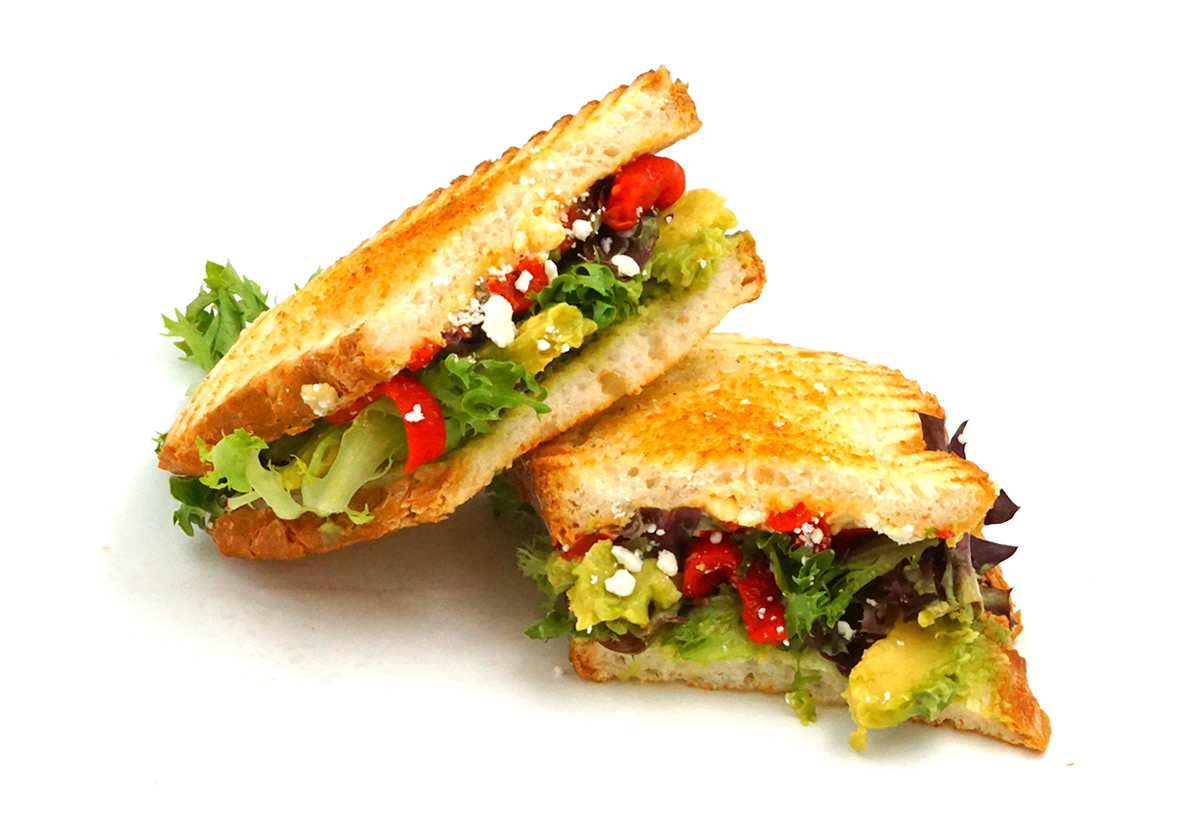 - Avocado, Roasted Red Pepper, Hummus, Feta Cheese, Salad Greens.
